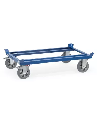 Construction en profilé d'acier mécano-soudé, revêtement époxy bleu RAL 5007, avec 4 inserts support de palettes. Pour palettes bois ou grillagées. 2 roues fixes et 2 roues pivotantes à bandage caoutchouc élastique confort, bleu-gris non traçant, moyeu à roulement à billes. Freins sur roues pivotantes. Peu de résistance au déplacement. Roulement élastique, sans bruit.