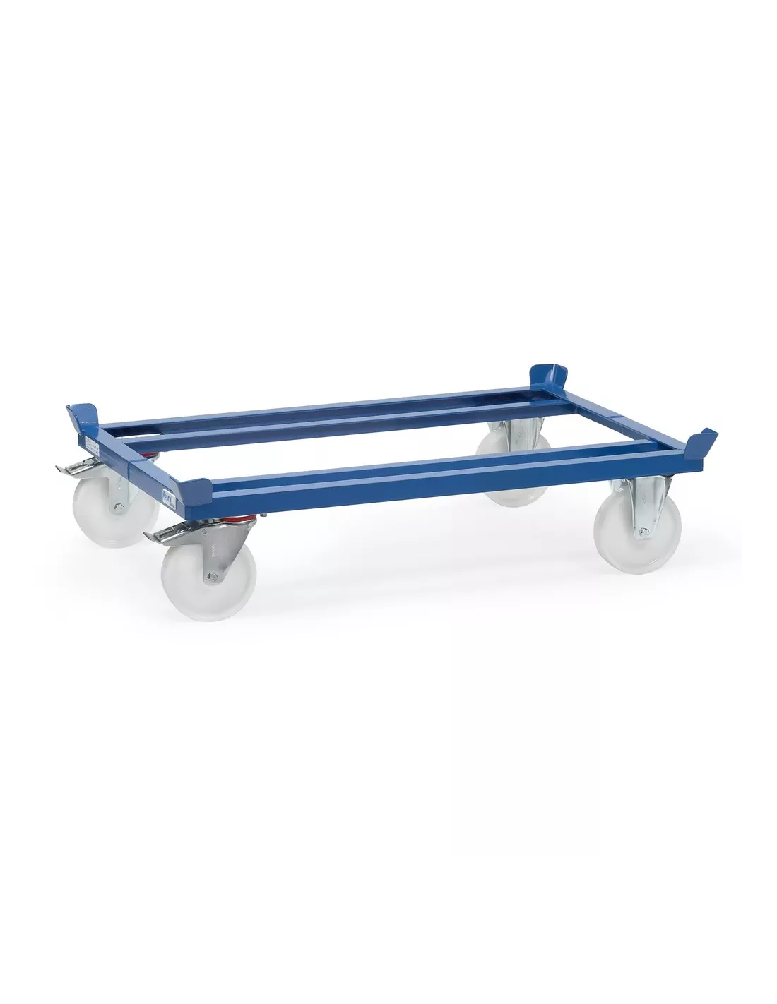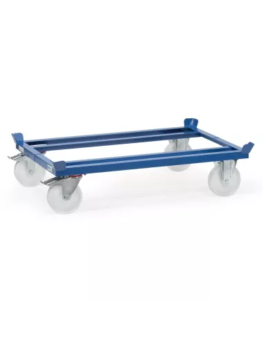Construction en profilé d'acier mécano-soudé, revêtement époxy bleu RAL 5007, avec 4 inserts support de palettes. Pour palettes bois ou grillagées. 2 roues fixes et 2 roues pivotantes en polyamide, moyeu à roulement à rouleaux. Freins sur roues pivotantes. Roulement aisé et non traçant mais bruyant. Roues résistantes aux agents corrosifs.