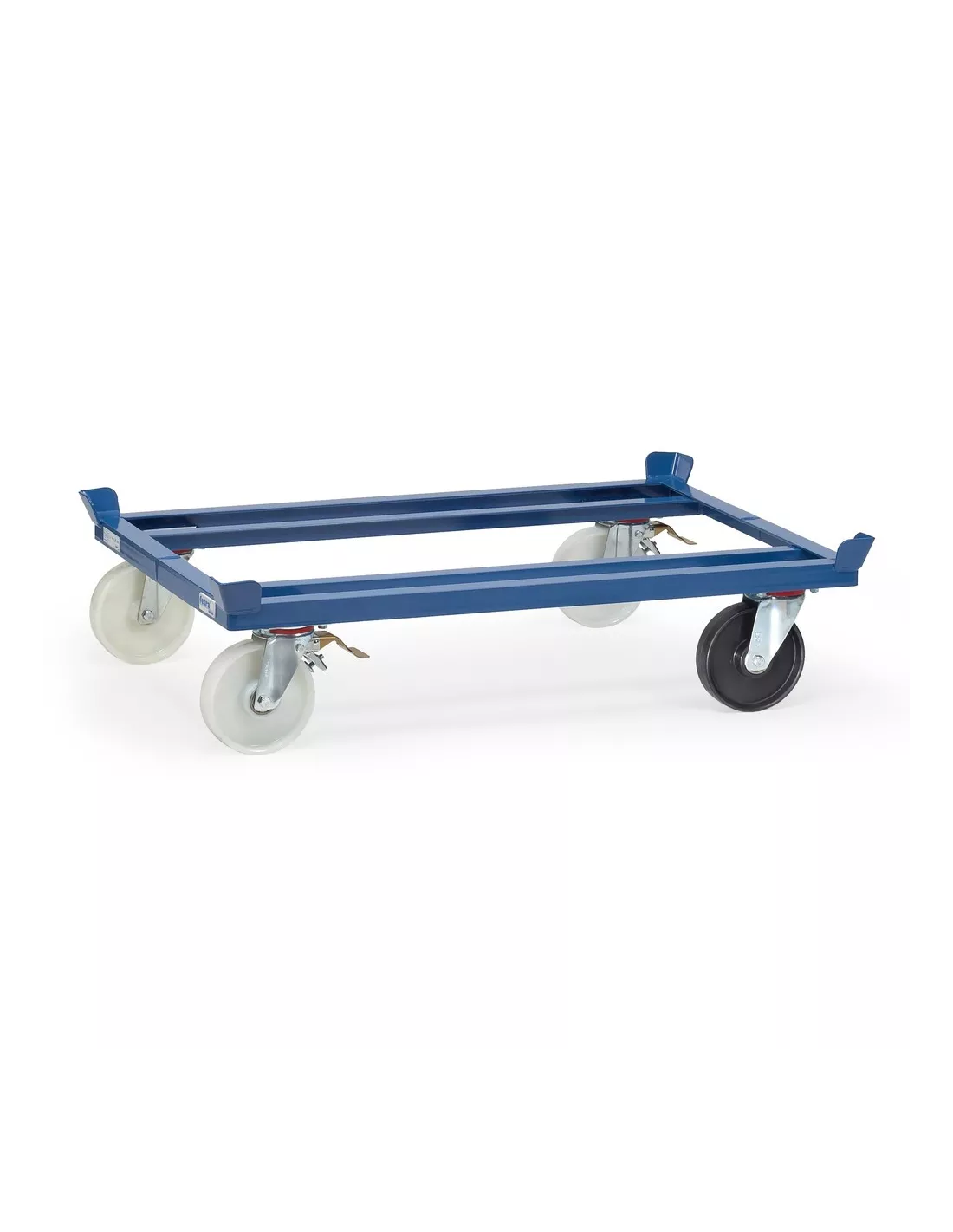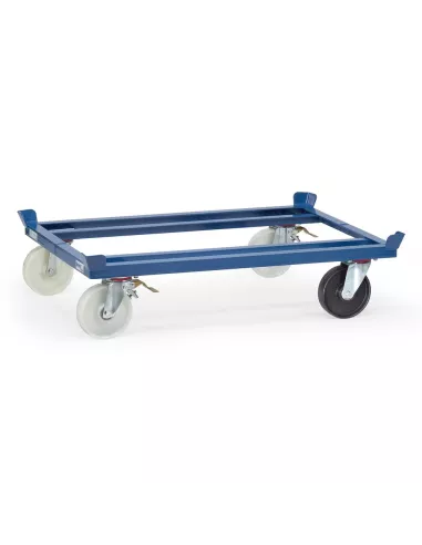 Construction robuste en profilé d'acier avec 4 coins de centrage, revêtement époxy bleu RAL 5007, 2 roues pivotantes en polyamide, moyeu à roulement à billes de précision, 2 roues pivotantes à freins placées sous le châssis et diagonalement. 1 roue conductrice d'électricité, chape en polypropylène noir, moyeu à roulement à billes de précision. Garde au sol 235 mm