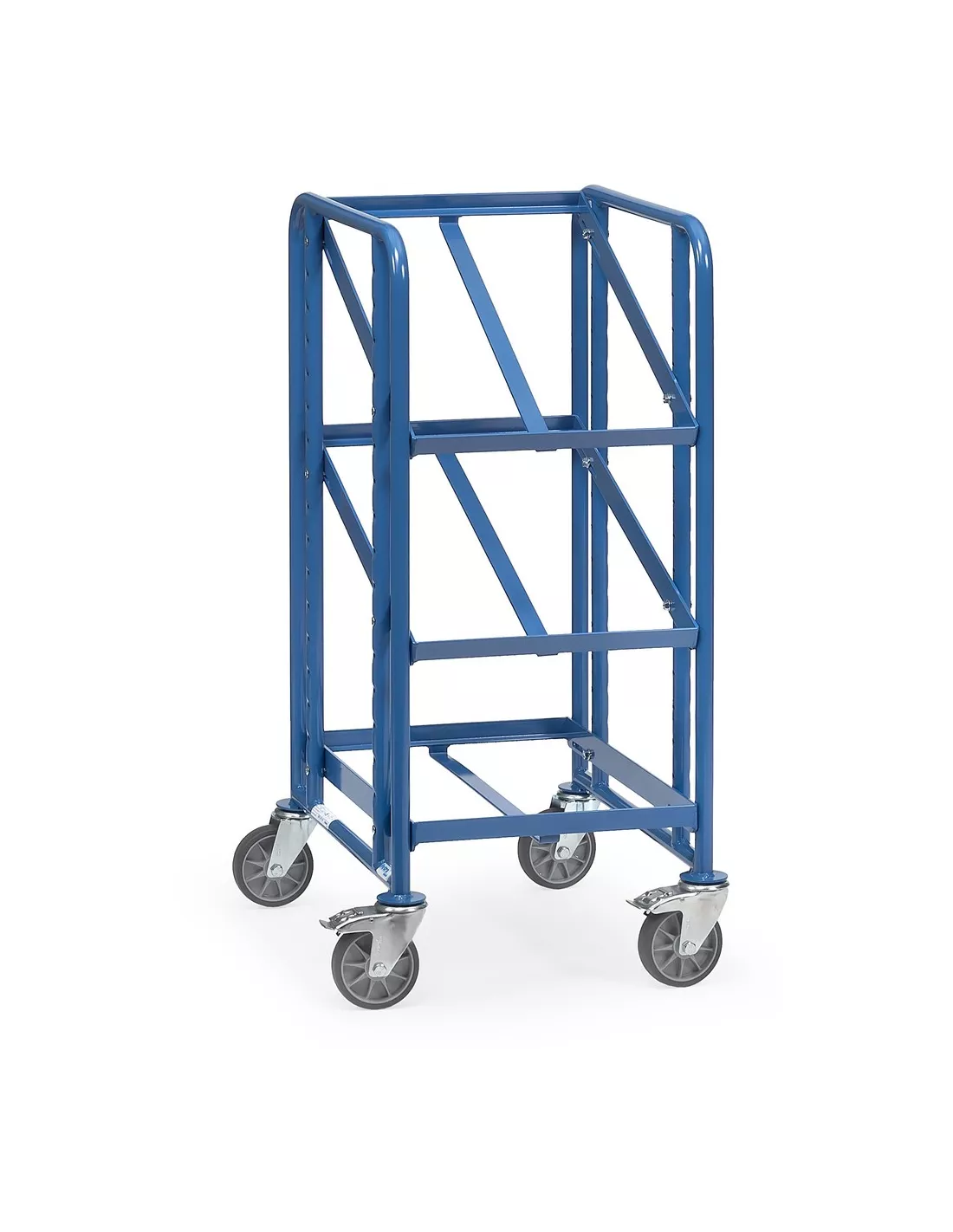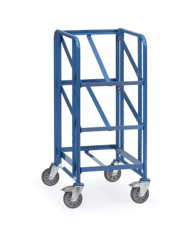 Ensemble mécano-soudé, revêtement époxy bleu RAL 5007. 3 plateaux amovibles en profilé avec armature ouverte pour 1 bac plastique 600 x 400 mm. Plateaux réglables au pas de 50 mm et inclinables de 15° et 30°. 4 roues pivotantes à bandage TPE, moyeu à roulement à billes. 2 roues avec freins. Charge plateau haut et intermédiaire: 80 kg. Livré sans bacs.
