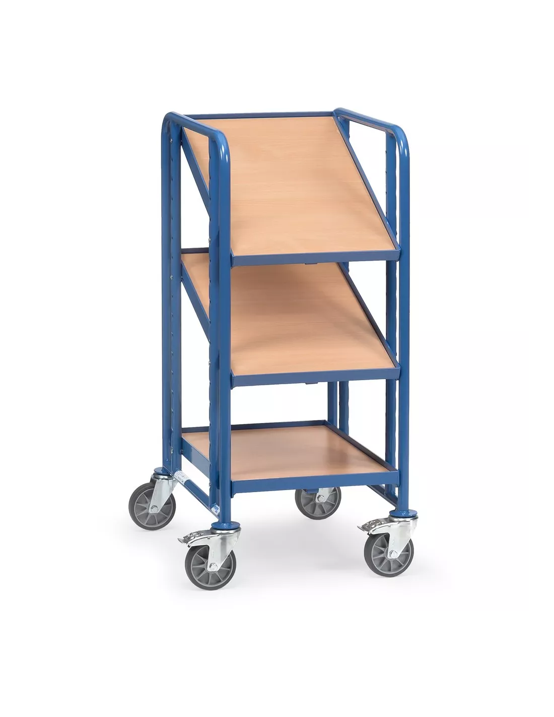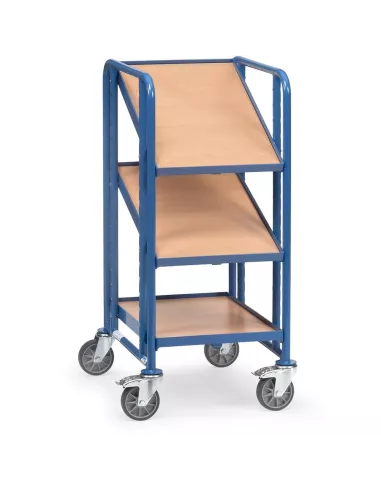 Ensemble mécano-soudé, revêtement époxy bleu RAL 5007. 3 plateaux amovibles avec mélaminé surface effet hêtre avec rebord de 13 mm. Plateaux réglables au pas de 50 mm et inclinables de 15° et 30°. 4 roues pivotantes à bandage TPE, moyeu à roulement à billes. 2 roues avec freins. Charge plateau haut et intermédiaire: 80 kg. Livré sans bacs