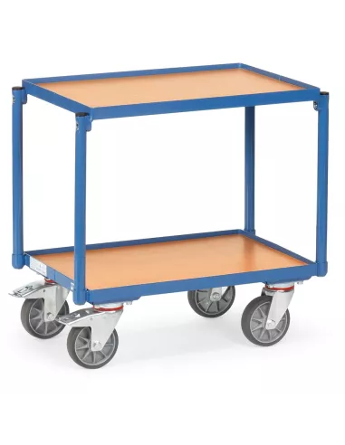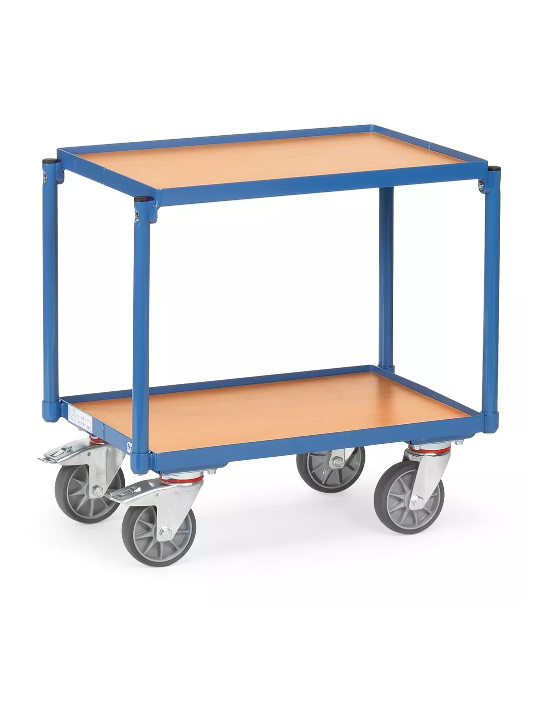 Construction en profilé d'acier, revêtement époxy bleu RAL 5007. 2 plateaux en mélaminé surface effet hêtre avec rebord de 15 mm, distance entre les plateaux: 400 mm. Hauteur totale: 639 mm. 4 roues pivotantes à bandage TPE, moyeu à roulement à billes central. 2 roues avec freins. Compatible pour bacs plastiques 600 x 400 mm.