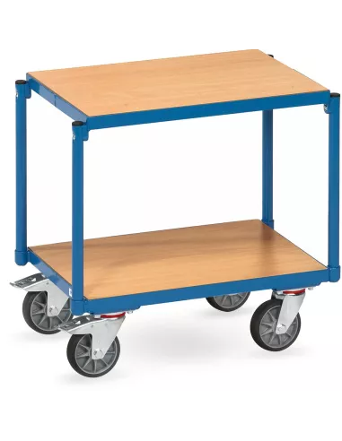 Construction en profilé d'acier, revêtement époxy bleu RAL 5007. 2 plateaux en mélaminé surface effet hêtre sans rebord, distance entre les plateaux: 400 mm. Hauteur totale: 639 mm. 4 roues pivotantes à bandage TPE, moyeu à roulement à billes central. 2 roues avec freins. Compatible pour bacs plastiques 600 x 400 mm.