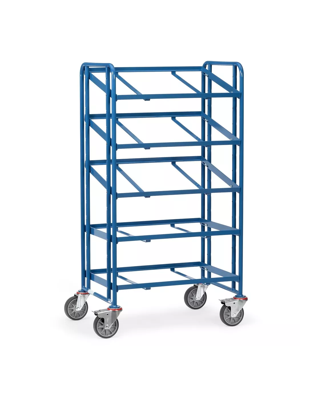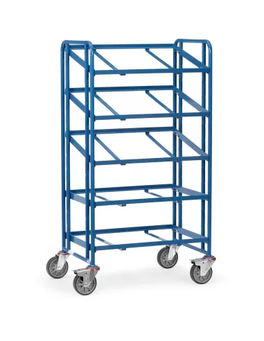 Ensemble mécano-soudé et vissé, revêtement époxy bleu RAL 5007. Plateaux amovibles dans supports réglables au pas de 100mm, inclinaison de 15° et 30°. 4 roues pivotantes à bandage TPE, moyeu à roulement à billes central. Freins sur roues pivotantes.