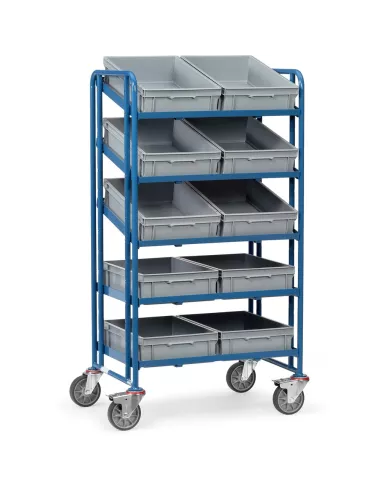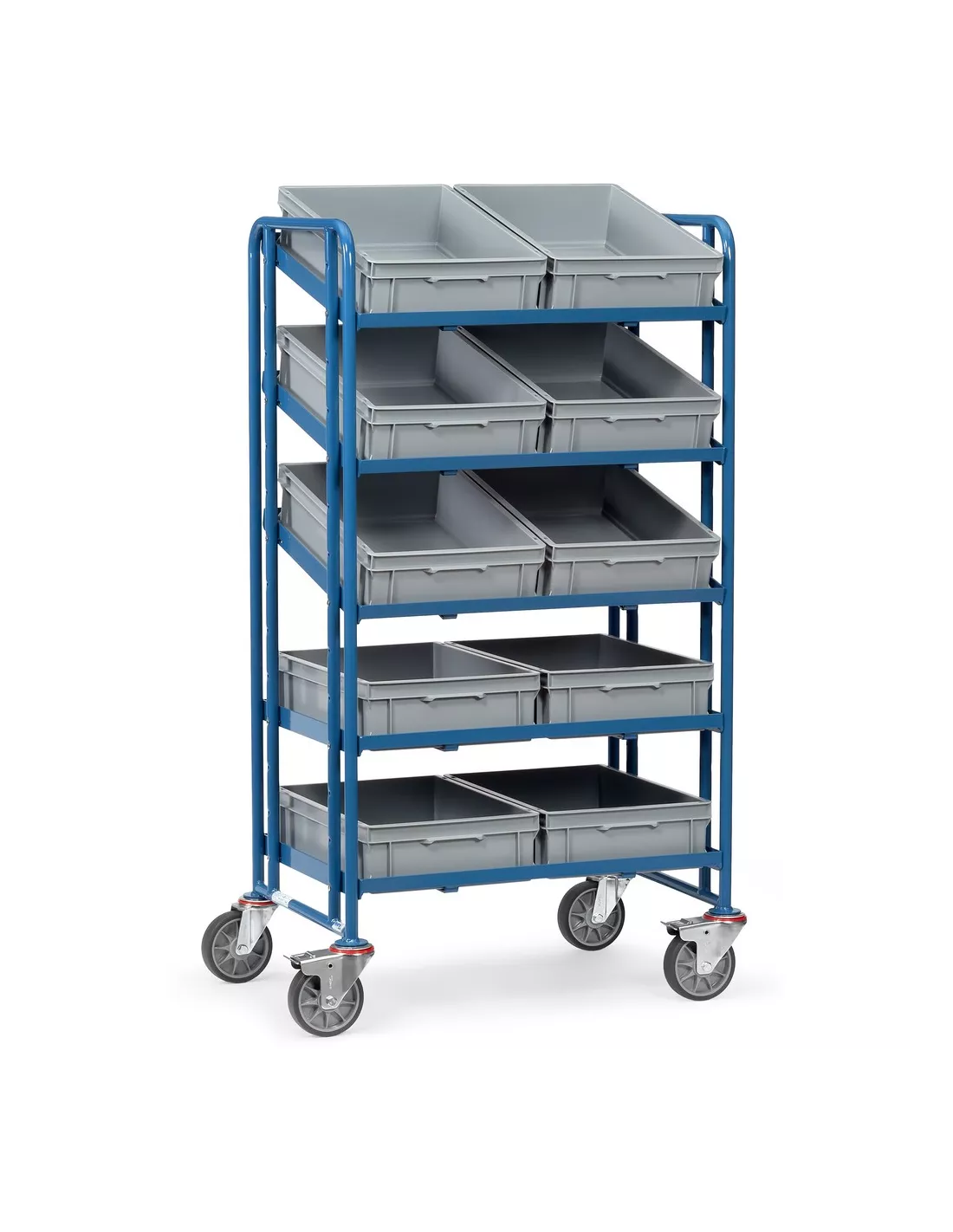 Ensemble mécano-soudé et vissé, revêtement époxy bleu RAL 5007. Plateaux amovibles dans supports réglables au pas de 100mm, inclinaison de 15° et 30°. Charge par plateau 80 kg. 5 niveaux avec 10 bacs euro 600 x 400 x 145 mm. 4 roues pivotantes à bandage TPE, moyeu à roulement à billes central. Freins sur roues pivotantes.