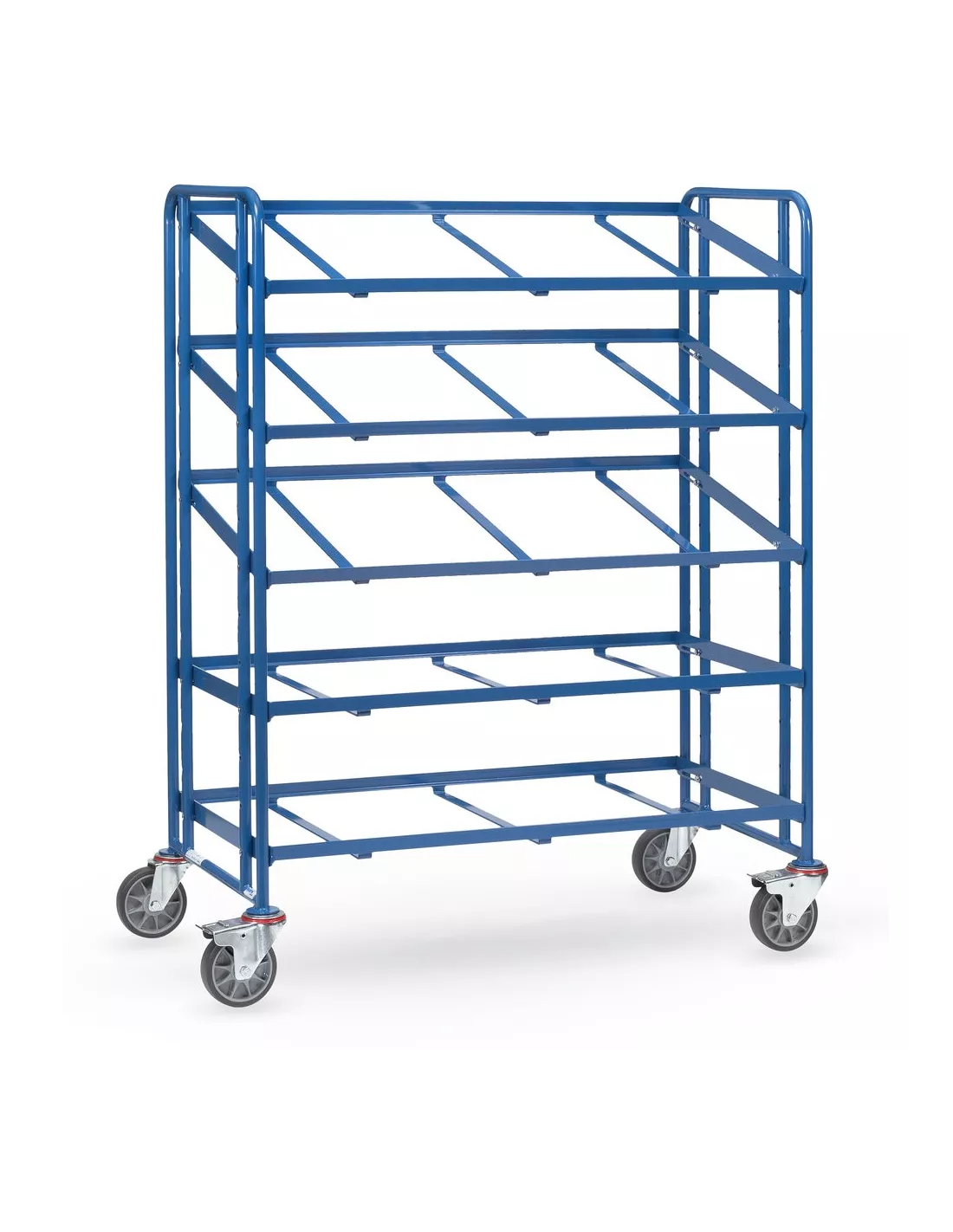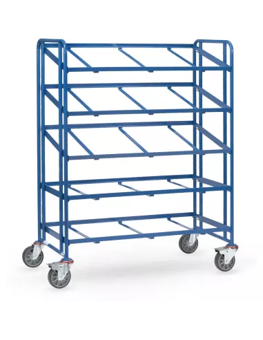 Ensemble mécano-soudé, revêtement époxy bleu RAL 5007. 5 plateaux amovibles en profilé avec armature ouverte pour 3 bacs plastiques 600 x 400 mm. Plateaux réglables au pas de 100 mm et inclinables de 15° et 30°. 4 roues pivotantes à bandage TPE, moyeu à roulement à billes. 2 roues avec freins. Charge par plateau: 80 kg. Livré sans bacs.