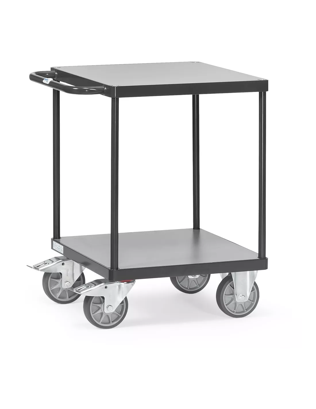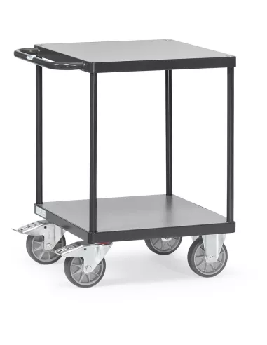 Ensemble mécano-soudé, revêtement époxy gris anthracite RAL 7016 avec plateaux carrés 600 x 600 mm en mélaminé surface gris moyen. Charge maximum plateau du haut: 200 kg. 2 roues pivotantes et 2 roues fixes à bandage TPE, moyeu à roulement à billes central. Freins sur roues pivotantes.