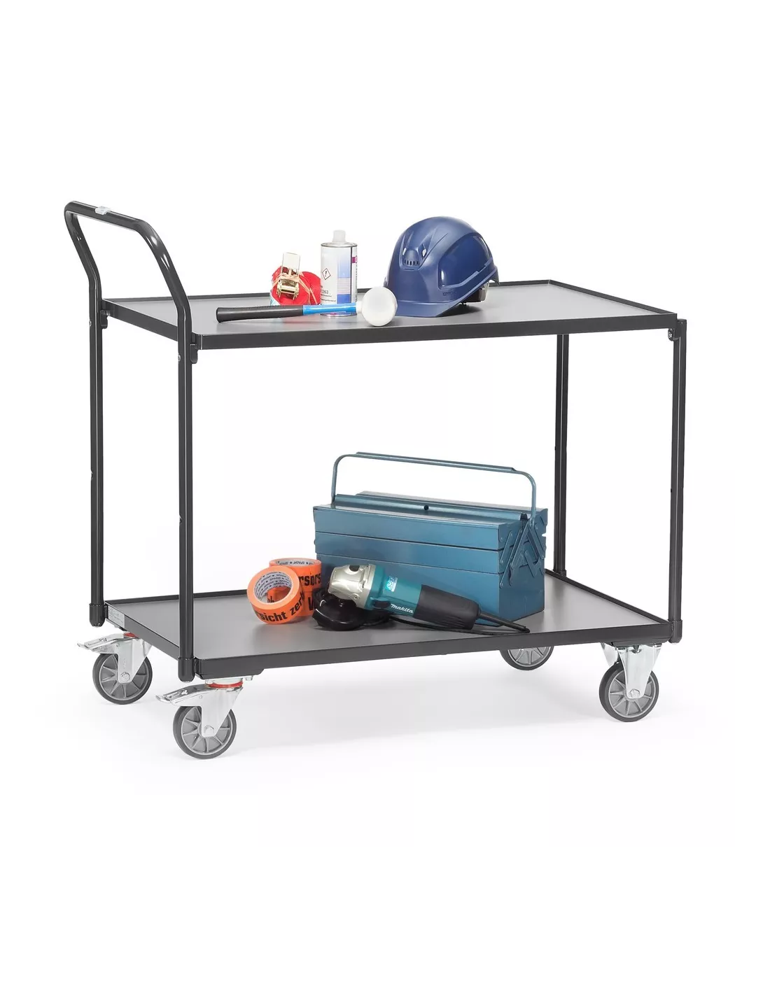 Ensemble mécano-soudé, revêtement époxy gris anthracite RAL 7016 avec 2 plateaux en mélaminé surface gris moyen, barre de poussée verticale, rebord de 12 mm. Charge maximum étagère haute: 80 kg. 2 roues pivotantes et 2 roues fixes à bandage TPE, moyeu à roulement à billes central. Freins sur roues pivotantes.