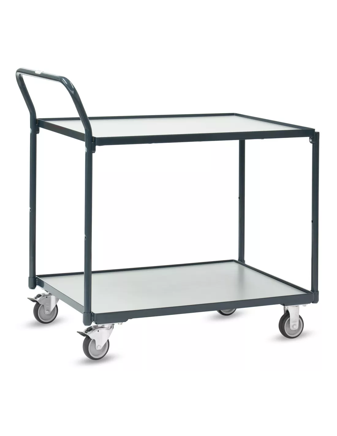 Servante très compacte et maniable pour une utilisation flexible au bureau, dans l'entrepôt et à l'atelier. Réduite à l'essentiel, dans la qualité éprouvée de fetra. Rapport qualité-prix optimal. Ensemble mécano-soudé, revêtement époxy gris anthracite RAL 7016 avec 2 plateaux en MDF mélaminé surface gris moyen, barre de poussée verticale, rebord de 12 mm. Charge maximum étagère haute: 80 kg. 2 roues pivotantes et 2 roues fixes à bandage TPE, moyeu à palier lisse central. Freins sur roues pivotantes. Livraison démontée, montage facile à réaliser soi-même.