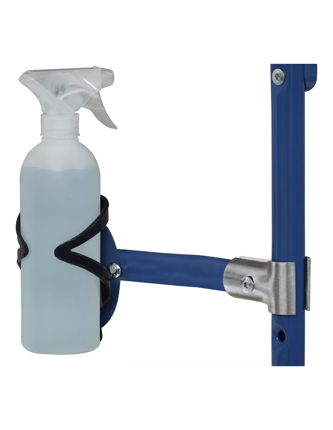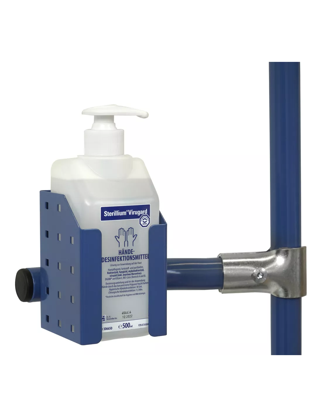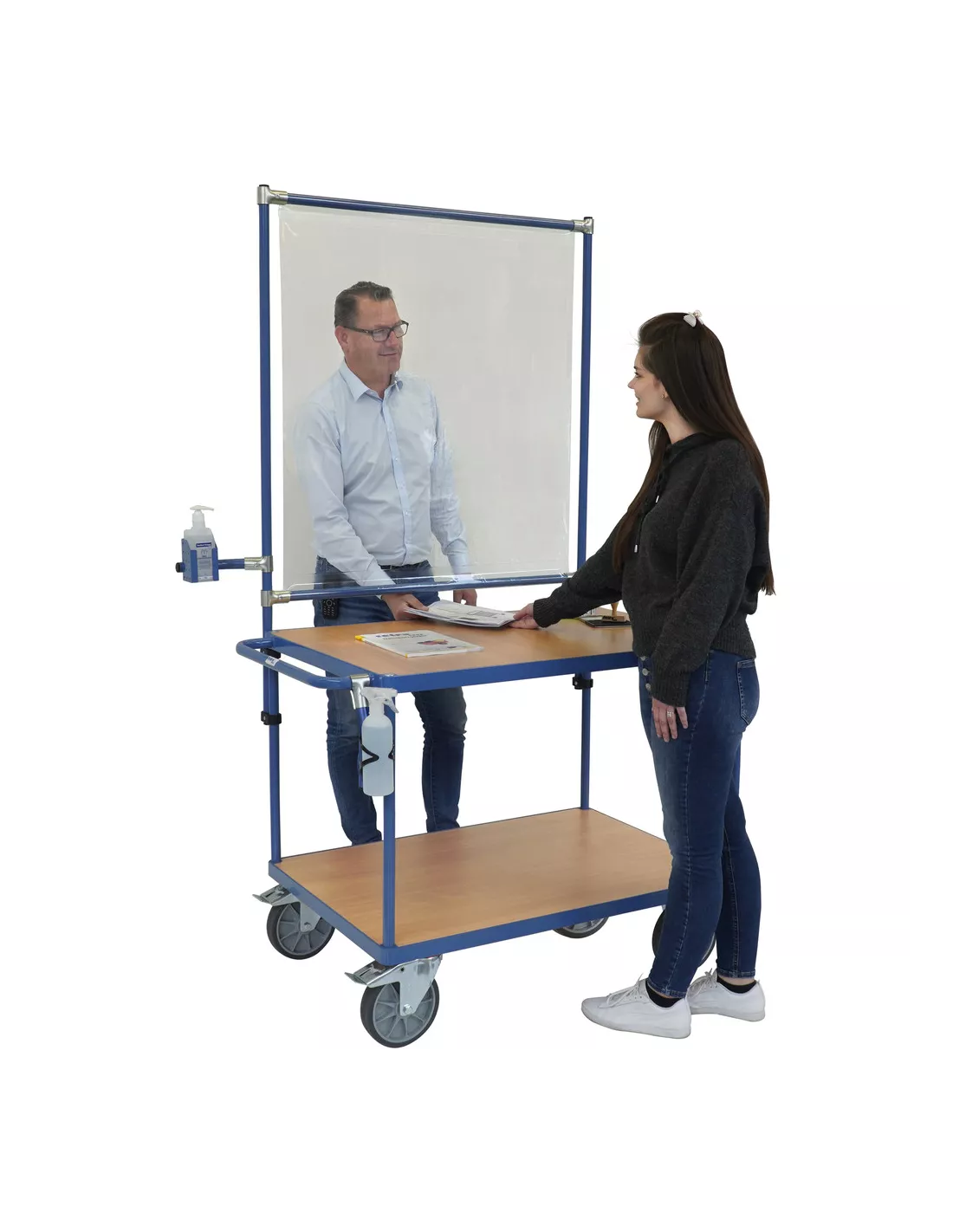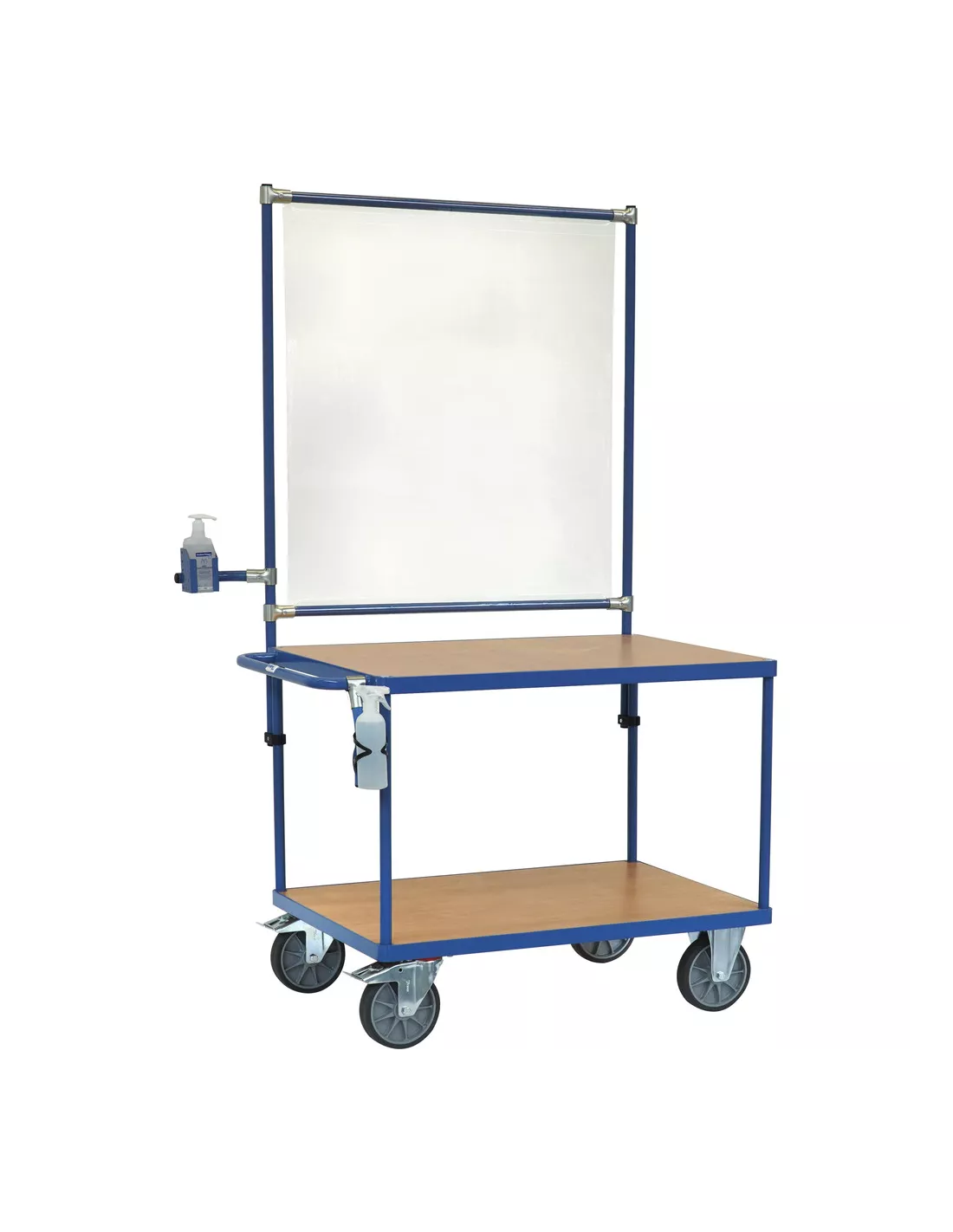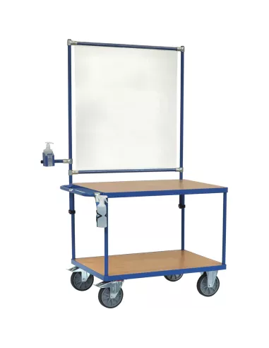 Ensemble mécano-soudé, revêtement époxy bleu RAL 5007 avec 2 plateaux en mélaminé surface effet hêtre. Charge maximum plateau du haut: 200 kg. 2 roues pivotantes et 2 roues fixes à bandage TPE, moyeu à roulement à billes central. Freins sur roues pivotantes. Également équipé d'un panneau de projections salivaires 5901, d'un support pour produit désinfectant 1393-B0500 (pour bouteille Bode de 500 ml) et d'un support bouteille pulvérisateur 1391. Bouteilles non incluses dans la livraison.