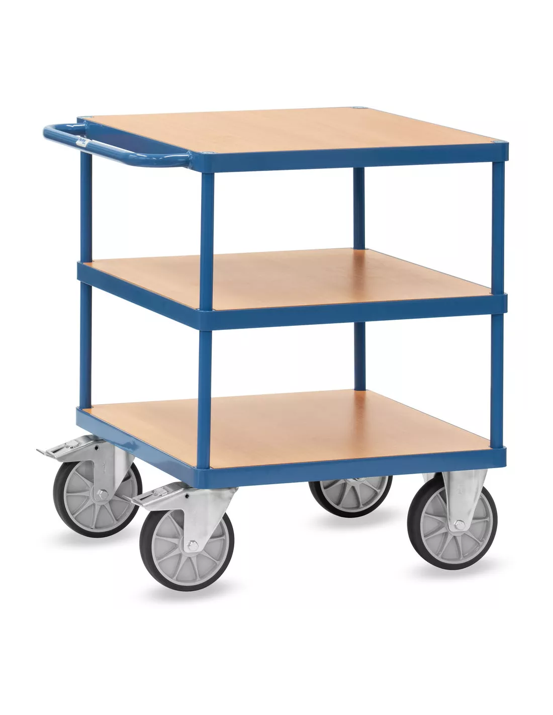 Ensemble mécano-soudé, revêtement époxy bleu RAL 5007 avec 3 plateaux carrés en mélaminé surface effet hêtre. Charge maximum plateau du haut: 200 kg. 2 roues pivotantes et 2 roues fixes à bandage TPE, moyeu à roulement à billes central. Freins sur roues pivotantes.