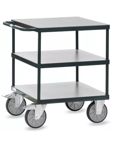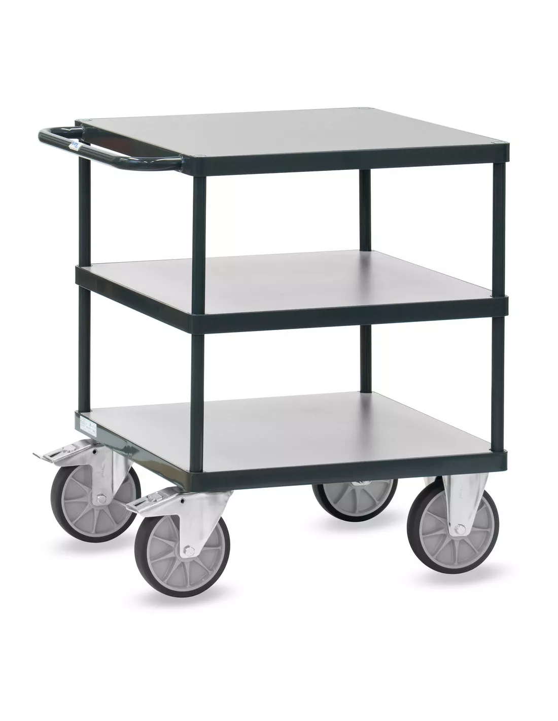 Ensemble mécano-soudé, revêtement époxy gris anthracite RAL 7016 avec 3 plateaux carrés en mélaminé surface gris moyen. Charge maximum plateau du haut: 200 kg. 2 roues pivotantes et 2 roues fixes à bandage TPE, moyeu à roulement à billes central. Freins sur roues pivotantes.