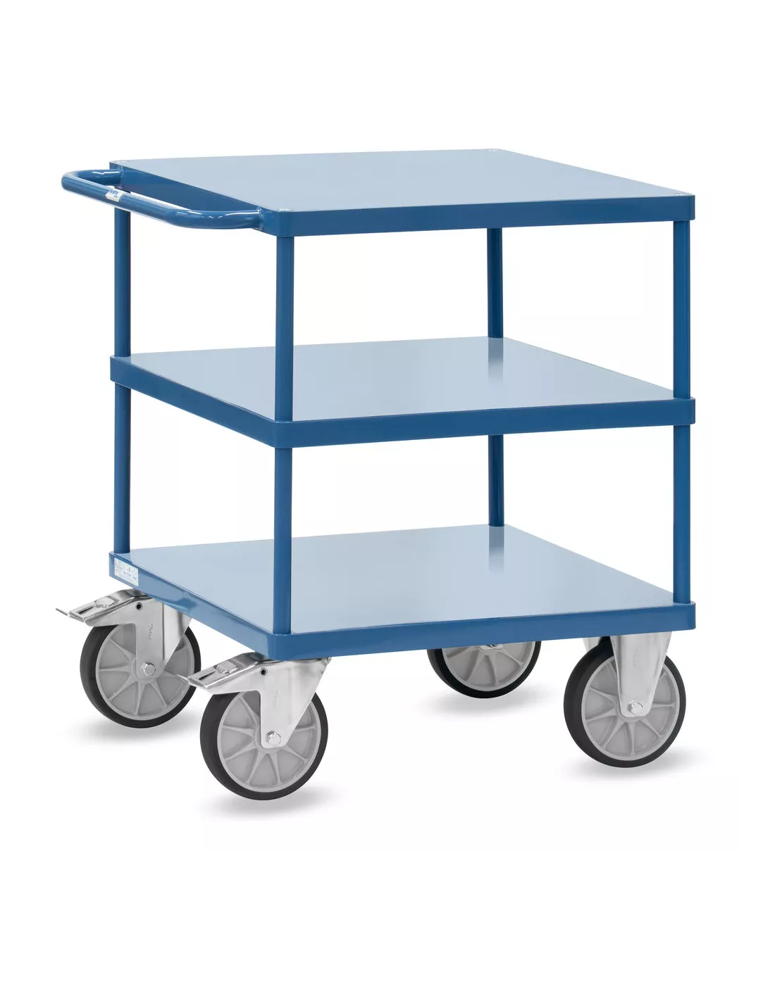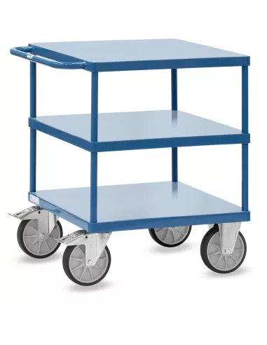 Ensemble mécano-soudé, revêtement époxy bleu RAL 5007, assemblé selon le principe des "inserts fetra". 3 plateaux en tôle d'acier soudé de niveau dans l'armature. 2 roues pivotantes et 2 fixes à bandage TPE, moyeu à roulement à billes central. Freins sur roues pivotantes. Charge maximum plateau du haut: 200 kg.