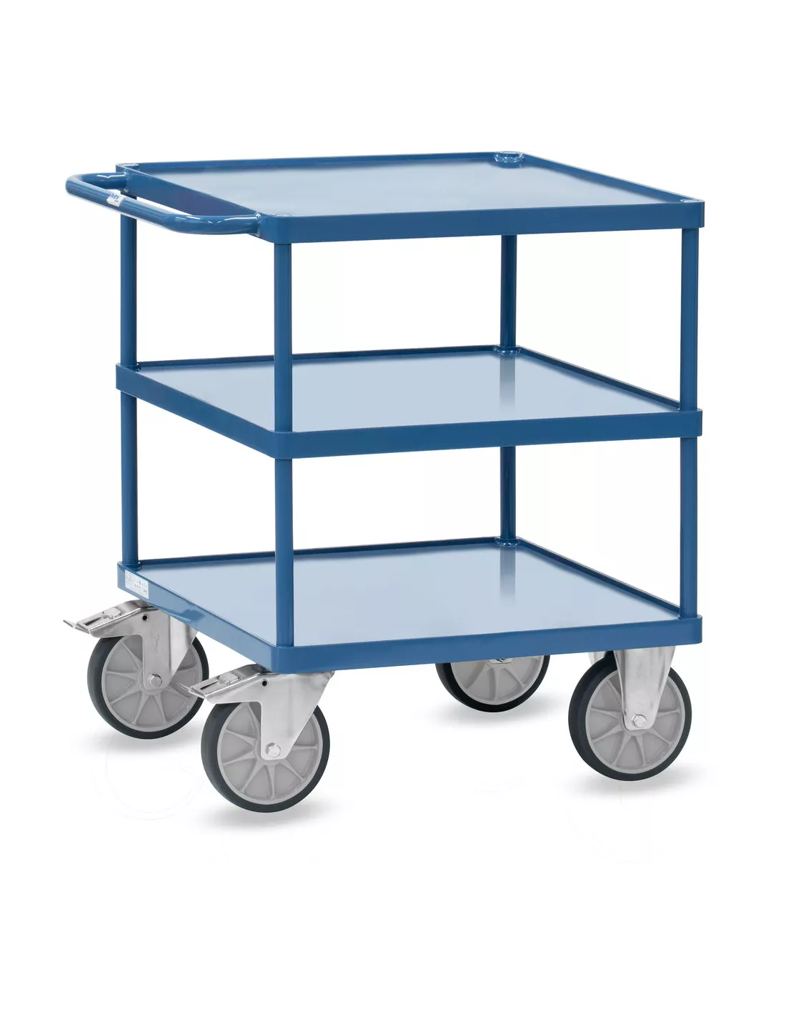 Ensemble mécano-soudé, revêtement époxy bleu RAL 5007, assemblé selon le principe des "inserts fetra". 3 plateaux en tôle d'acier soudé avec rebord de 10 mm de haut. 2 roues pivotantes et 2 fixes à bandage TPE, moyeu à roulement à billes central. Freins sur roues pivotantes. Charge maximum plateau du haut: 200 kg.