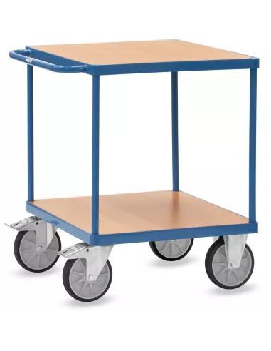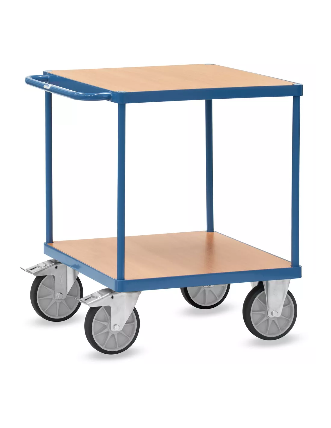 Ensemble mécano-soudé, revêtement époxy bleu RAL 5007 avec 2 plateaux carrés en mélaminé surface effet hêtre. Charge maximum plateau du haut: 200 kg. 2 roues pivotantes et 2 roues fixes à bandage TPE, moyeu à roulement à billes central. Freins sur roues pivotantes.
