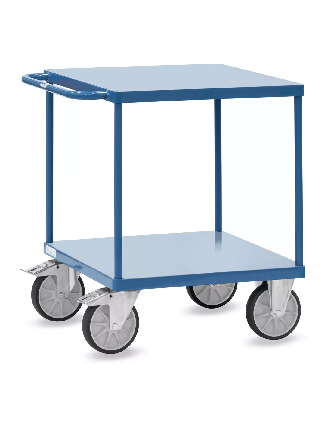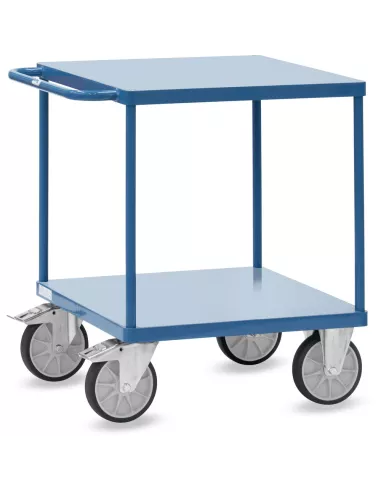 Système modulable: ensemble mécano-soudé, revêtement époxy RAL 5007, assemblé selon le principe des "inserts fetra". 2 plateaux en tôle d'acier soudé de niveau dans l'armature. 2 roues pivotantes et 2 fixes à bandage TPE, moyeu à roulement à billes central. Freins sur roues pivotantes. Charge maximum plateau du haut: 200 kg.