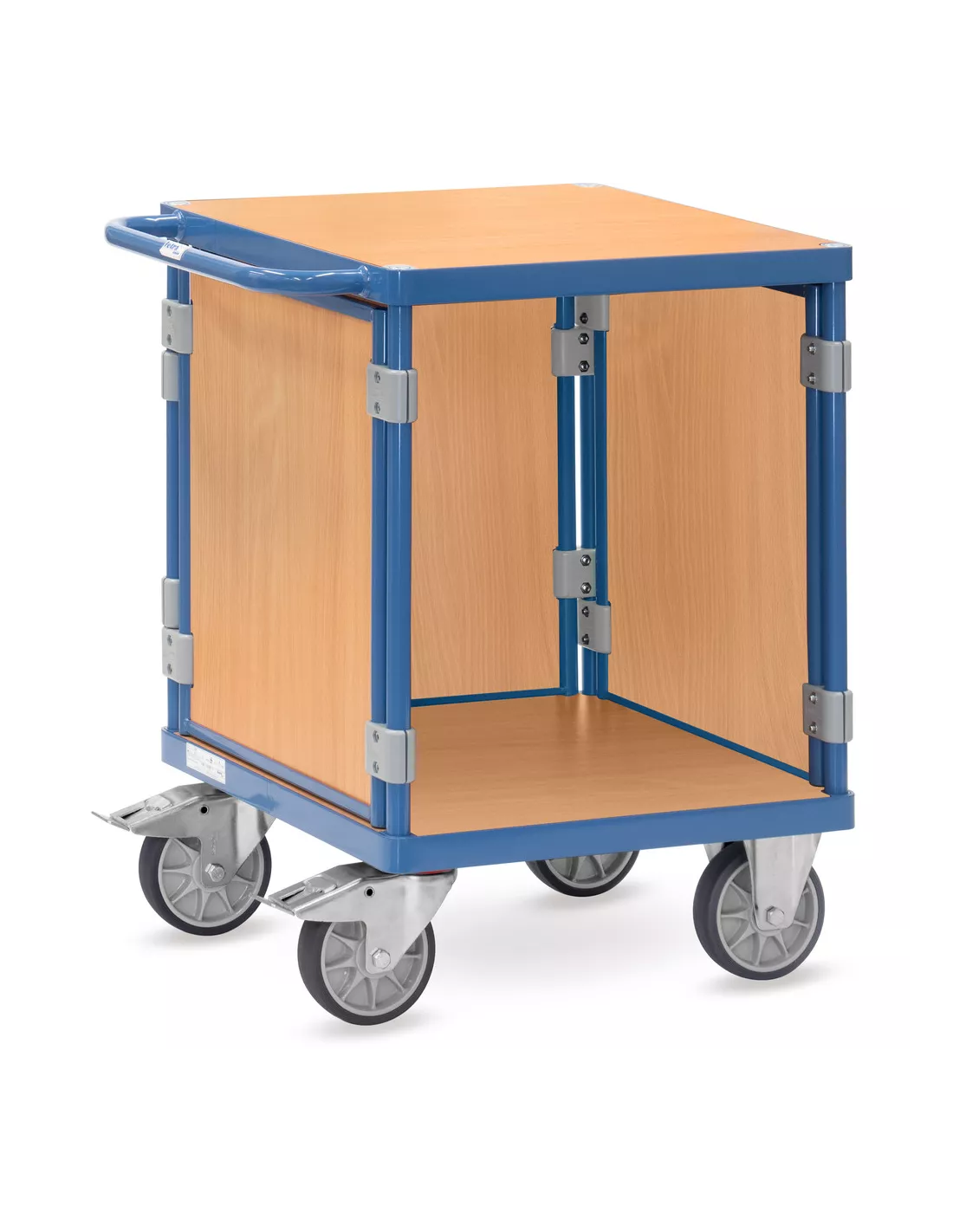 Ensemble mécano-soudé, revêtement époxy bleu RAL 5007 avec 2 plateaux en mélaminé surface effet hêtre. Charge maximum plateau du haut: 200 kg. Fermé sur trois côtés avec 2 parois frontales et 1 paroi longitudinale, à monter au moyen d’attaches en plastique. 2 roues pivotantes et 2 roues fixes à bandage TPE, moyeu à roulement à billes central. Freins sur roues pivotantes.