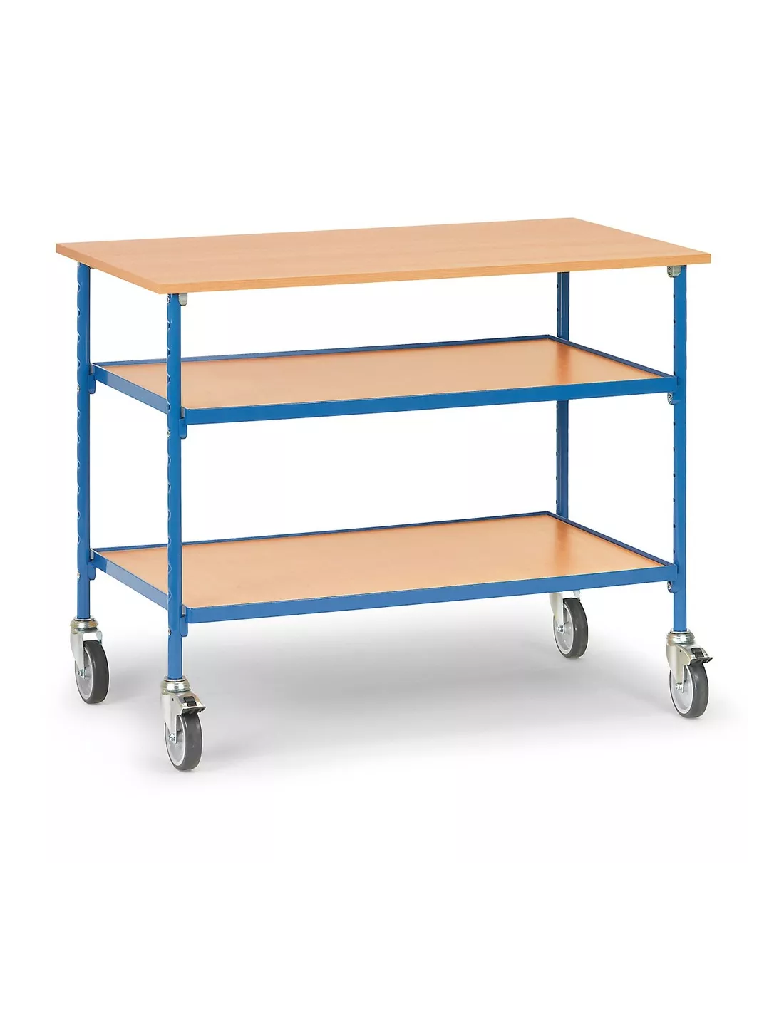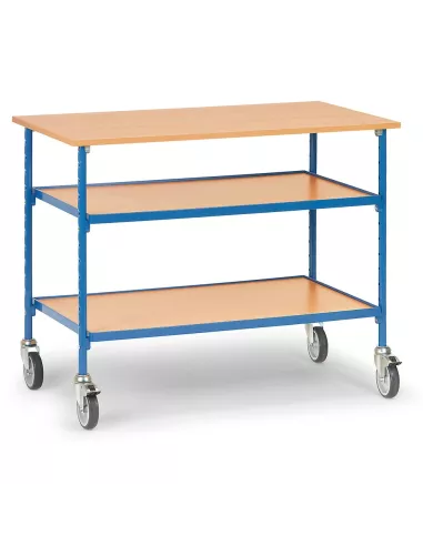 Ensemble mécano-soudé et boulonné, revêtement époxy bleu RAL 5007. Plan de travail en mélaminé renforcé épaisseur 20 mm, surface effet hêtre, 2 plateaux amovibles réglables au pas de 50 mm, compatible pour 1 hauteur de classeur. 4 roues pivotantes à bandage TPE, roulement à palier lisse. 2 roues avec freins. Charge maximum par plateau: 50 kg.