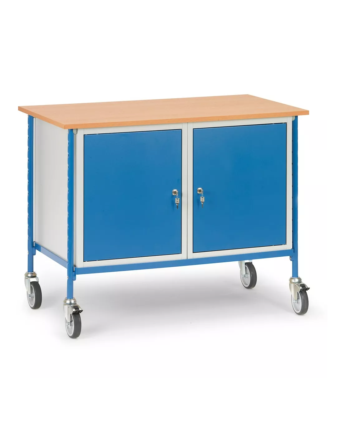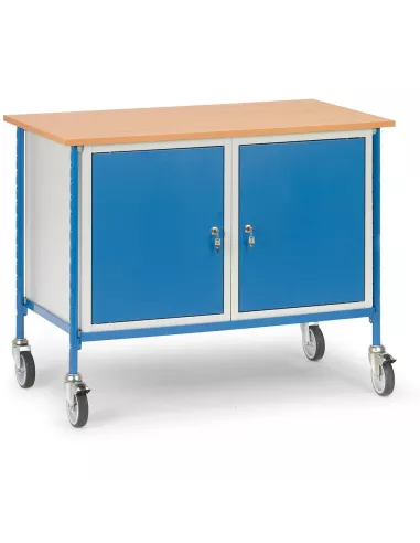 Ensemble mécano-soudé et boulonné, revêtement époxy, caisson gris RAL 7035, armature et ouvertures RAL 5007. Plan de travail en mélaminé renforcé épaisseur 20 mm, surface effet hêtre, 2 placards verrouillables avec portes. Dimensions placard LXPXH: 500 x 600 x 600 mm. Charge maximum par plateau placard: 30 kg. 4 roues pivotantes à bandage TPE, roulement à palier lisse. 2 roues avec freins.