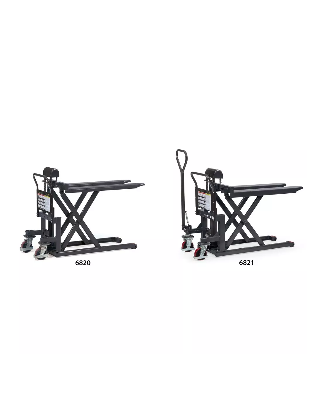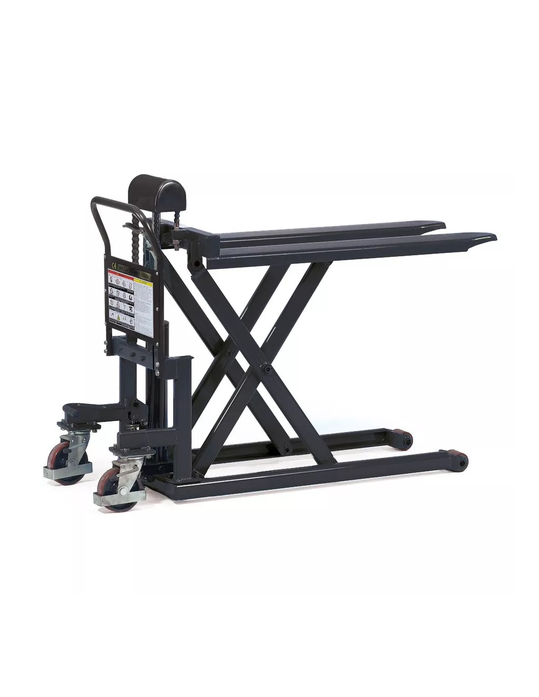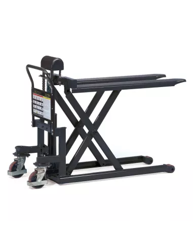 Très stable, peut être déplacé même chargé en position haute. Châssis et fourches en tôle d'acier, revêtement époxy anthracite RAL 7016. Dossier de poussée très solide, pompe hydraulique avec piston chromé, montée par pédale, descente par molette. 2 roues pivotantes avec freins.