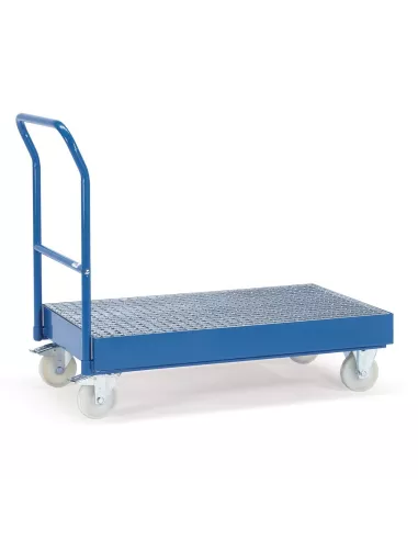 Dimensions utiles (L x l) : 1250 x 650 mm, Charge 600 kg, chariot porte-fûts avec bac étanche et dossier de poussée.